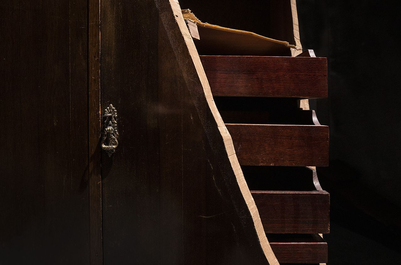 A veneer is, quintessentially, an attractive skin that masks a core material. We live in a world that masks the unsightly. For all manner of reasons, we find ways to alter the look of ourselves, our consumables, politics, actions and so on. We’re the masters of disguise. Yet when our relationship to Rowlands’ domestic forms is altered – when the cavernous spaces of a wardrobe are revealed and the seeping stain of the timber veneer is exposed – we experience something greater than just truth telling. Heightened by the faint smell of perfume, waxed leather and stale wet wool, we experience nostalgia and we begin to imagine.